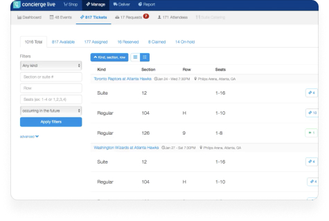 Leverage Concierge Live’s sync technology to seamlessly buy and sell tickets with a simple click. Seamlessly navigate the secondary market using the same interface as all of your other tickets. Keep everything organized and tracked, all in one place.
