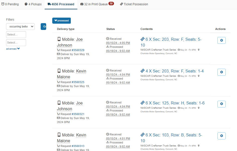 Effortlessly track your ticket deliveries all in one place. Create shipping labels, packing slips or transfer mobile tickets right from the system. For each delivery action, requestors and attendees are sent an easy-to-read notification allowing the user to click and track all of their shipping details.